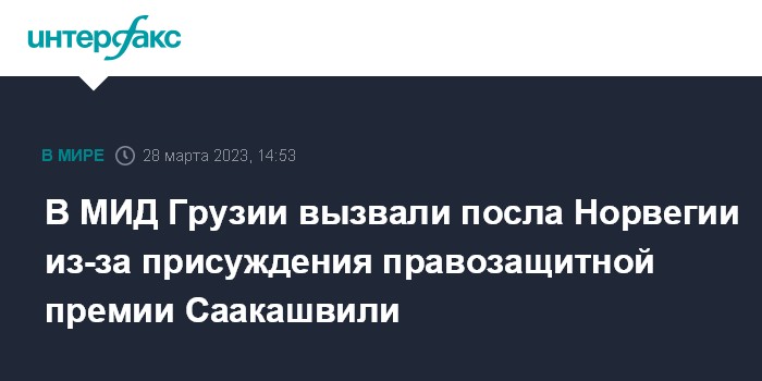 Москва. 28 марта. INTERFAX.RU - Посол Норвегии в Тбилиси Хелен Санд Андерсен была приглашена в МИД Грузии в связи с тем, что Норвежская консервативная партия присудила экс-президенту Грузии Михаилу Саакашвили премию за продвижение прав человека, сообщает грузинское внешнеполитическое ведомство.