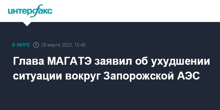 Москва. 28 марта. INTERFAX.RU - Обстановка вокруг Запорожской АЭС за последнее время ухудшилась, из-за чего возросли риски возникновения инцидента в ядерной сфере, заявил в интервью Associated Press гендиректор МАГАТЭ Рафаэль Гросси.