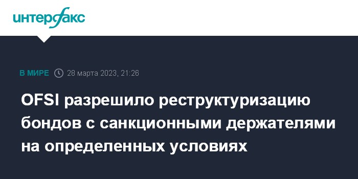 Москва. 28 марта. INTERFAX.RU - Управление по осуществлению финансовых санкций Великобритании (OFSI) разрешило эмитентам проводить реструктуризацию и изменения условий выпусков бондов, владельцами которых являются российские санкционные лица, при условии, что такие держатели не получат выгоды, а средства, предназначенные им, будут заморожены.