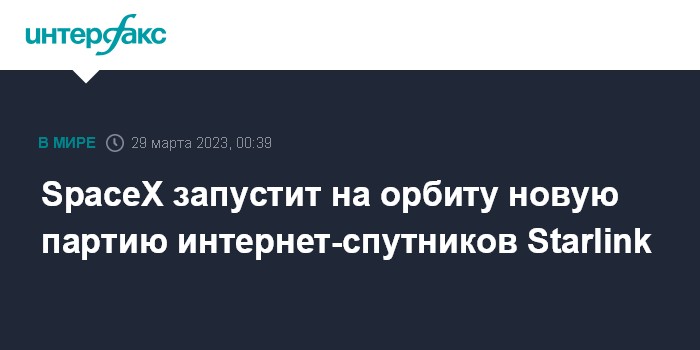 Москва. 29 марта. INTERFAX.RU - Ракета-носитель Falcon 9 в среду стартует на орбиту с очередной партией из 56 мини-спутников для пополнения орбитальной группировки глобальной сети интернет-покрытия системы Starlink, сообщила компания-разработчик SpaceX.
