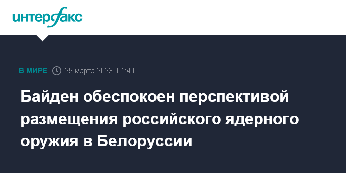 Москва. 29 марта. INTERFAX.RU - Президент США Джо Байден выразил обеспокоенность в связи с планами размещения на территории Белоруссии российского тактического ядерного оружия, сообщают американские СМИ.