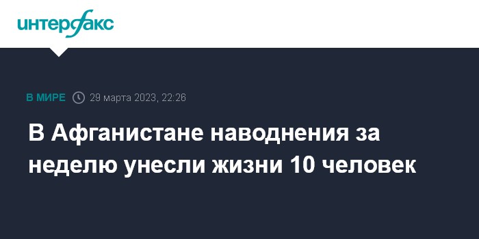 Москва. 29 марта. INTERFAX.RU - В Афганистане за неделю наводнения унесли жизни 10 человек, 76 получили ранения, сообщает Tolo News со ссылкой на министерство по борьбе со стихийными бедствиями.