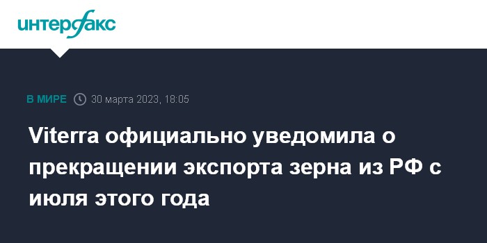 Москва. 30 марта. INTERFAX.RU - Мировой зернотрейдер Viterra официально уведомила, что с 1 июля этого года прекращает экспорт российского зерна.