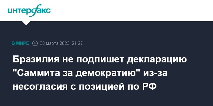 "Власти Бразилии приняли решение не подписывать итоговую декларацию "Саммита за демократию"... По словам источников, правительство Лулы да Силвы не согласно с акцентом... на использование саммита для осуждения России", - говорится в сообщении.