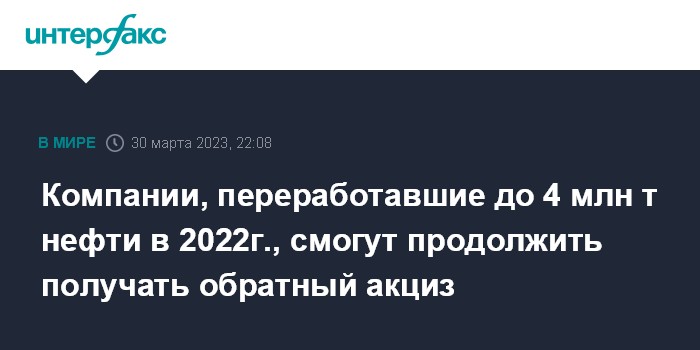 Компании, переработавшие до 4 млн т нефти в 2022г., смогут продолжить получать обратный акциз