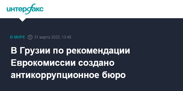 Москва. 31 марта. INTERFAX.RU - В Грузии создано новое ведомство - антикоррупционное бюро, что было одним из 12 рекомендаций Еврокомиссии для получения статуса страны-кандидата в члены Евросоюза.