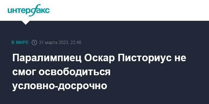 Москва. 31 марта. INTERFAX.RU - Атлет-паралимпиец Оскар Писториус по решению пенитенциарного департамента не сможет выйти досрочно из тюрьмы, где отбывает срок за убийство своей подруги Ривы Стенкамп, сообщает АР.