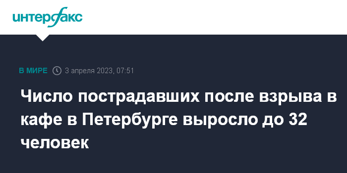 Москва. 3 апреля. INTERFAX.RU - В результате взрыва в кафе в Санкт-Петербурге в результате пострадали 32 человека, сообщили в пресс-службе Минздрава России.