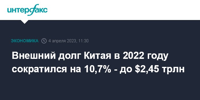 Москва. 4 апреля. INTERFAX.RU - Внешний долг Китая на конец 2022 года составлял $2,45 трлн, свидетельствуют данные Государственного управления валютного контроля (SAFE). Об этом сообщает "Синьхуа".