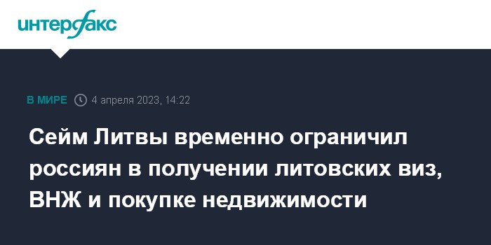 Москва. 4 апреля. INTERFAX.RU - Сейм Литвы принял закон, временно ограничивающий возможности граждан России и Белоруссии получать литовские визы, подавать заявление на получение вида на жительство (ВНЖ), покупать недвижимость, а также ввозить и вывозить украинские гривны, передает агентство BNS.