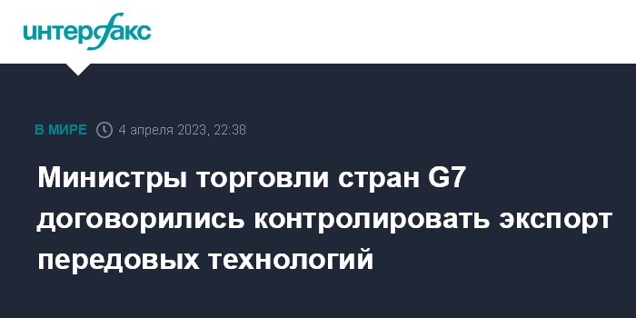 Москва. 4 апреля. INTERFAX.RU - Министры торговли стран G7 во вторник пришли к соглашению о необходимости сотрудничать в сфере контроля за экспортом новейших технологий.