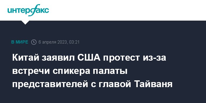 Москва. 6 апреля. INTERFAX.RU - МИД КНР заявил проест в связи с состоявшейся в США встречей спикера палаты представителей американского Конгресса Кевина Маккарти и главы администрации Тайваня Цай Инвэнь.