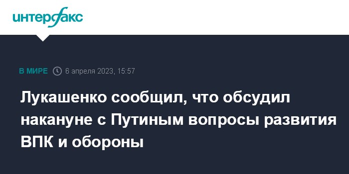 Москва. 6 апреля. INTERFAX.RU - Президент Белоруссии Александр Лукашенко заявил, что накануне на переговорах с президентом РФ Владимиром Путиным стороны обсудили много вопросов, связанных с развитием военно-промышленного комплекса и обороны, и все необходимые решения при этом были достигнуты.