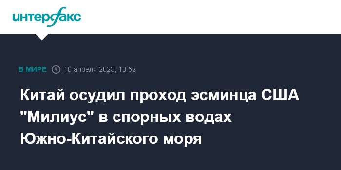 Москва. 10 апреля. INTERFAX.RU - В командовании Народно-освободительной армии Китая (НОАК) подвергли критике проход эсминца ВМС США USS Milius ("Милиус") в водах в районе островов Наньша (английское название - Спратли) в Южно-Китайском море, вокруг которых ведут территориальный спор КНР и ряд других стран.