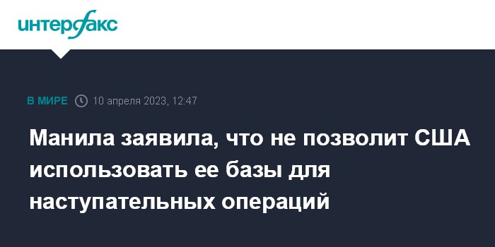 Москва. 10 апреля. INTERFAX.RU - Манила не позволит американским военным использовать четыре филиппинских военных базы, доступ к которым США получили недавно, для наступательных операций, заявил президент Филиппин Фердинанд Маркос-младший.