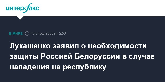 Москва. 10 апреля. INTERFAX.RU - Президент Белоруссии Александр Лукашенко заявил о необходимости защиты Россией Белоруссии как своей территории в случае нападения на республику.