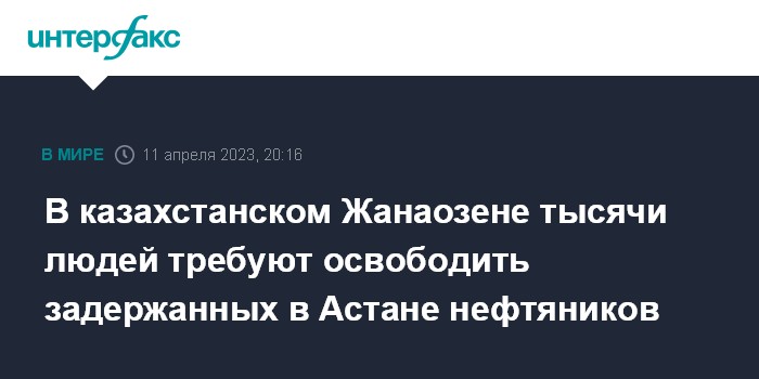 Москва. 11 апреля. INTERFAX.RU - На центральной площади в городе Жанаозен (Мангистауская область на западе Казахстана) собралось уже почти 2 тысячи человек, которые требуют освобождения задержанных в Астане нефтяников, сообщает интернет-журнал "Власть".