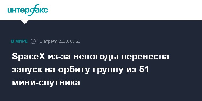 Москва. 12 апреля. INTERFAX.RU - Запуск ракеты Falcon 9 с группой из 51 исследовательского мини-спутника в рамках миссии Transporter 7, планировавшийся в среду, перенесен на два дня в связи с неблагоприятными погодными условиями, сообщила компания-разработчик носителя SpaceX.
