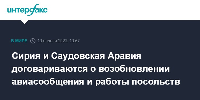 Москва. 13 апреля. INTERFAX.RU - Сирия и Саудовская Аравия после более чем десяти лет разрыва дипломатических отношений намерены возобновить работу посольств и восстановить авиасообщение между странами, передает АР со ссылкой на совместное заявление сторон после переговоров высокопоставленных дипломатов.