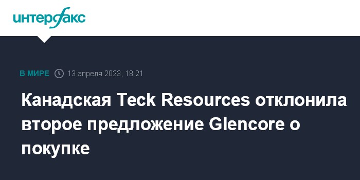 Москва. 13 апреля. INTERFAX.RU - Канадская горнодобывающая компания Teck Resources Ltd отклонила второе предложение о покупке, поступившее от Glencore, посчитав, что оно не отвечает интересам ее акционеров.