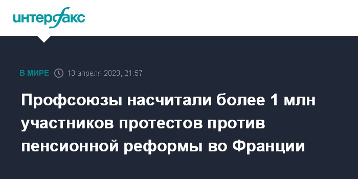 Москва. 13 апреля. INTERFAX.RU - Свыше 1 млн человек приняли участие в четверг в акциях протеста против пенсионной реформы во Франции, сообщил крупнейший профсоюз Всеобщая конфедерация труда (CGT).