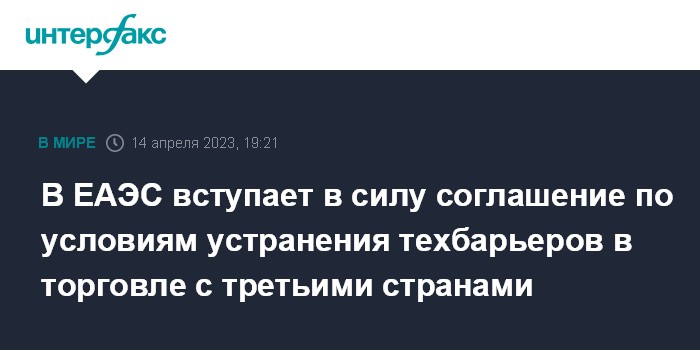 Москва. 14 апреля. INTERFAX.RU - Соглашение о порядке и условиях устранения технических барьеров во взаимной торговле с третьими странами вступает в силу в ЕАЭС 15 апреля, сообщила пресс-служба Евразийской экономической комиссии.