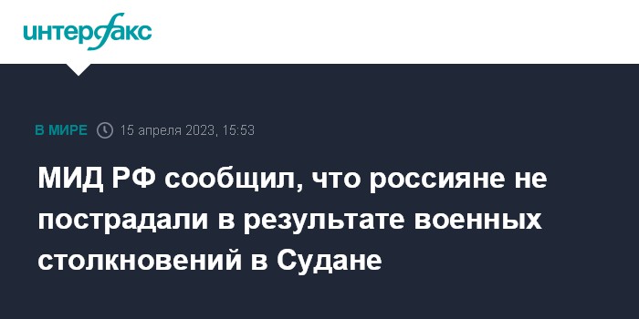 Москва. 15 апреля. INTERFAX.RU - МИД РФ сообщил, что россиян нет среди пострадавших в результате резкого обострения обстановки в столице Судана Хартуме, где идут вооруженные столкновения.