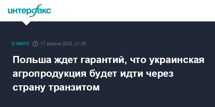 Москва. 17 апреля. INTERFAX.RU - Польша хочет получить гарантии того, что украинская сельхозпродукция будет следовать через страну транзитом, а для этого нужны правовые изменения, заявил через пресс-службу министр сельского хозяйства Польши Роберт Телус.