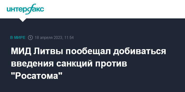 Москва. 18 апреля. INTERFAX.RU - Поскольку Евросоюз рассматривает новый пакет санкций в отношении России, Литва предлагает ввести ограничительные меры против "Росатома", разделив их на части для принятия решении отдельно по каждой из них, заявил журналистам министр иностранных дел Литвы Габриэлюс Ландсбергис.