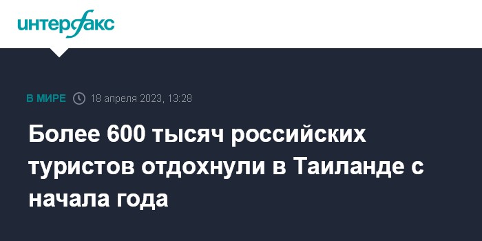 Москва. 18 апреля. INTERFAX.RU - Более 600 тысяч российских туристов прибыли в Таиланд с 1 января по 15 апреля 2023 года, по итогам 5,5 последних месяцев турпоток приближается к миллиону, сообщила во вторник замглавы представительства Тайского управления по туризму (ТАТ) в Москве Чатчадарач Кулахонг.