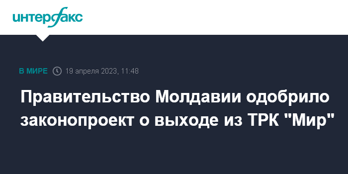 Москва. 19 апреля. INTERFAX.RU - Правительство Молдавии одобрило законопроект о прекращении участия Молдавии в межгосударственной телерадиокомпании (МТРК) "Мир".