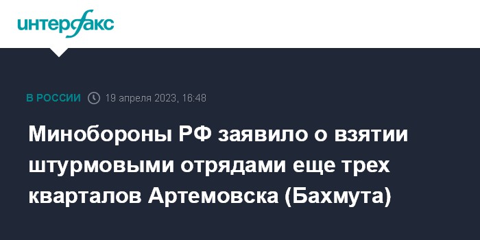 Москва. 19 апреля. INTERFAX.RU - Минобороны РФ заявило о взятии под контроль еще трех кварталов Артемовска (Бахмута).