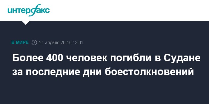Москва. 21 апреля. INTERFAX.RU - Более 400 человек стали жертвами и свыше 3,5 тыс. человек получили ранения за неделю боевых действий в Судане, передает в пятницу канал "Аль-Джазира" со ссылкой на данные ВОЗ.