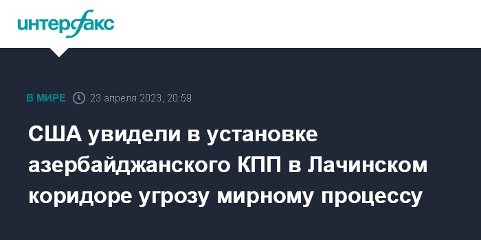 Москва. 23 апреля. INTERFAX.RU - Установление Азербайджаном контрольно-пропускного пункта в Лачинском коридоре, связывающем Армению с Нагорным Карабахом, подрывает доверие к мирному процессу, заявил заместитель руководителя пресс-службы госдепартамента США Ведант Пател.