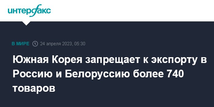 Москва. 24 апреля. INTERFAX.RU - Южная Корея ужесточает контроль за экспортом ряда товаров в Россию и Белоруссию, сообщает информагентство "Ренхап" со ссылкой на южнокорейское министерство торговли.