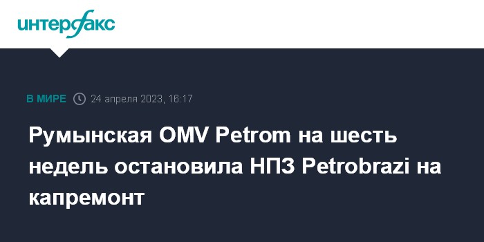 Москва. 24 апреля. INTERFAX.RU - Румынская OMV Petrom (контролируется австрийской нефтяной компанией OMV) в понедельник остановила свой нефтеперерабатывающий завод Petrobrazi вблизи города Плоешти (Румыния) на капитальный ремонт, сообщает компания.