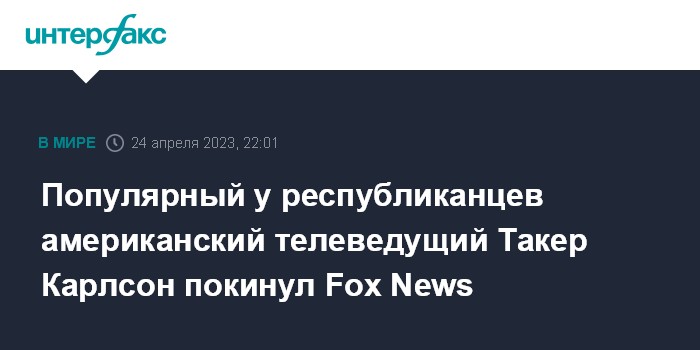 Москва. 24 апреля. INTERFAX.RU - Один из наиболее популярных журналистов с республиканскими взглядами и сторонников экс-президента США Дональда Трампа телеведущий Такер Карлсон покинул американский канал Fox News, говорится в заявлении компании Fox News Media.