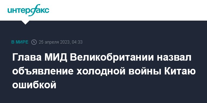 Москва. 25 апреля. INTERFAX.RU - Министр иностранных дел Великобритании Джеймс Клеверли во вторник в ходе своего выступления, посвященного отношениям с Китаем, заявит, что объявление холодной войны Пекину было бы ошибкой.