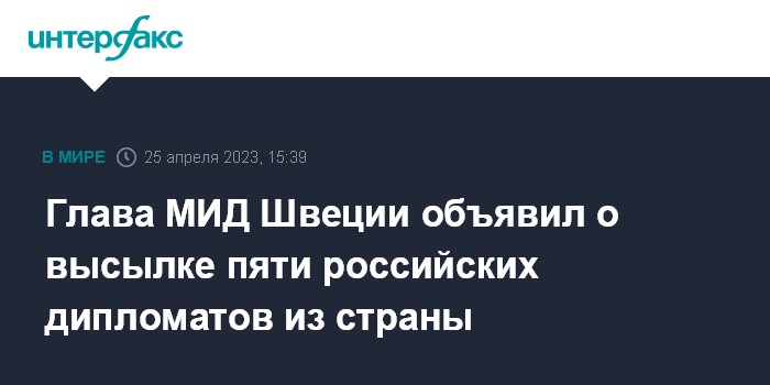 Москва. 25 апреля. INTERFAX.RU - Власти Швеции объявили пять российских дипломатов персонами нон грата, сообщил во вторник шведский министр иностранных дел Тобиас Биллстрём.