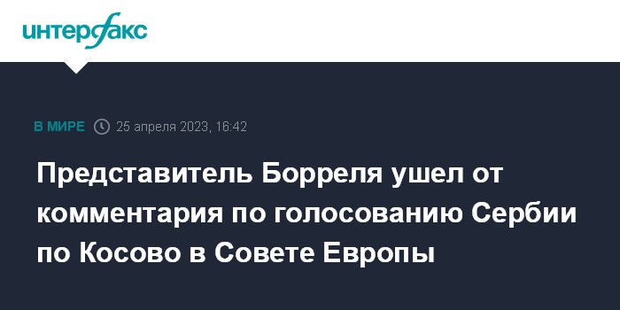 Москва. 25 апреля. INTERFAX.RU - Официальный представитель главы дипломатии ЕС Жозепа Борреля Петер Стано не стал отвечать напрямую на вопрос, не нарушила ли Сербия условия предложенного Брюсселем плана нормализации отношений с Приштиной, проголосовав в Совете Европы против процедуры приема Косово в эту организацию.