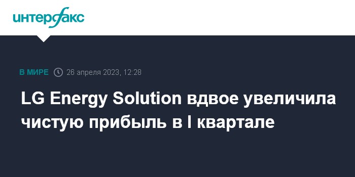 Москва. 26 апреля. INTERFAX.RU - Южнокорейский производитель аккумуляторов LG Energy Solution Ltd увеличил чистую прибыль в первом квартале 2023 года более чем вдвое благодаря высокому спросу на батареи для электромобилей в США и Европе.