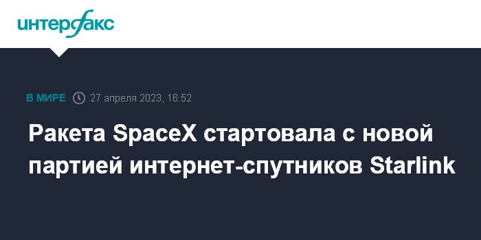 Москва. 27 апреля. INTERFAX.RU - Ракета-носитель Falcon 9 в четверг стартовала на орбиту с очередной партией из 46 мини-спутников для пополнения орбитальной группировки глобальной сети интернет-покрытия системы Starlink, сообщила компания-разработчик SpaceX.