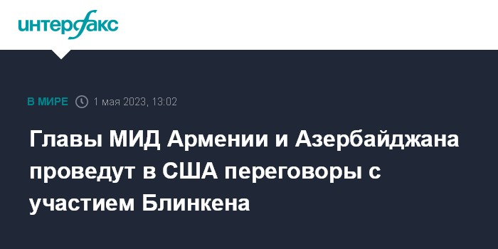 Москва. 1 мая. INTERFAX.RU - Министры иностранных дел Азербайджана и Армении Джейхун Байрамов и Арарат Мирзоян в понедельник в Арлингтоне (США, штат Вирджиния) проведут переговоры с участием госсекретаря Соединенных Штатов Энтони Блинкена, сообщает госдеп.