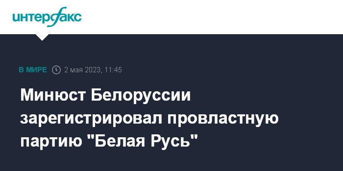 Москва. 2 мая. INTERFAX.RU - Министерство юстиции Белоруссии зарегистрировало провластную партию "Белая Русь", сообщило агентство "БелТА".
