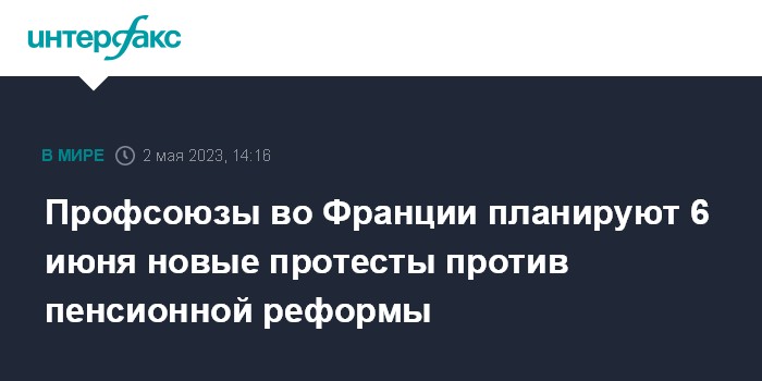 Москва. 2 мая. INTERFAX.RU - Профсоюзные организации во вторник согласовали проведение 6 июня новых акций протеста против пенсионной реформы во Франции, сообщают французские СМИ.