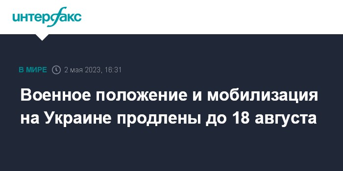 "Срок действия военного положения и мобилизации в Украине продлевается с 05 часов 30 минут 20 мая 2023 года на 90 суток, то есть до 18 августа 2023 года. Это было уже седьмое голосование парламента за военное положение", - цитируют СМИ запись депутата в соцсетях.