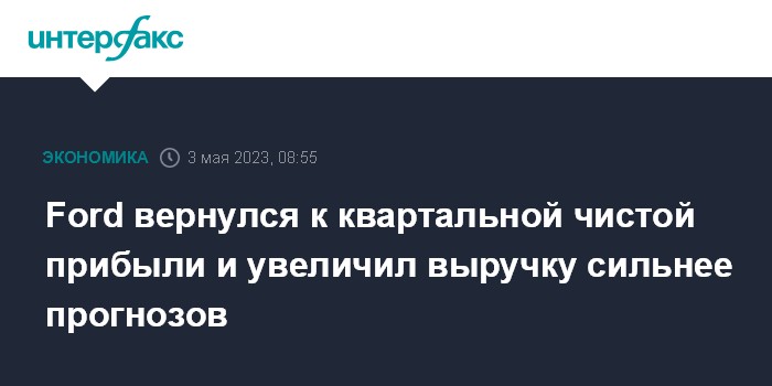 Москва. 3 мая. INTERFAX.RU - В I квартале 2023 года американский автопроизводитель Ford Motor получил чистую прибыль, а его выручка и скорректированная прибыль существенно превысили прогнозы рынка.