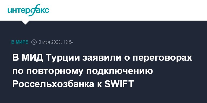 Москва. 3 мая. INTERFAX.RU - В рамках "зерновой сделки" возможно повторное подключение Россельхозбанка к системе SWIFT, но не исключено и появление турецкого банка в качестве посредника, заявил глава МИД Турции Мевлют Чавушоглу. Об этом сообщает Anadolu.