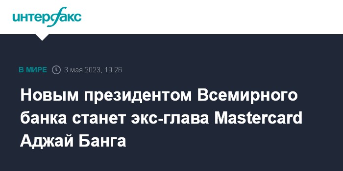 Москва. 3 мая. INTERFAX.RU - Новым президентом Всемирного банка (ВБ) станет Аджай Банга, занимавший в прошлом пост руководителя Mastercard Inc.