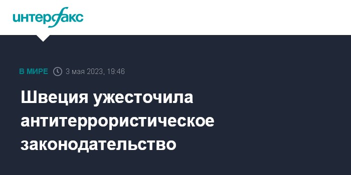Москва. 3 мая. INTERFAX.RU - Парламент Швеции принял поправки, ужесточающие действующее законодательство по борьбе с терроризмом. Как сообщает АР, ожидается, этот шаг может переубедить Турцию, которая пока отказывается одобрить на вступление Швеции в НАТО